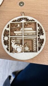 Décoration de Noël en bois détaillée, présentant un chat au coin du feu, idéale pour les fêtes.