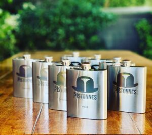 Flasques en acier inoxydable avec le logo Les Pistonnés, cadeaux personnalisés pour un événement spécial.