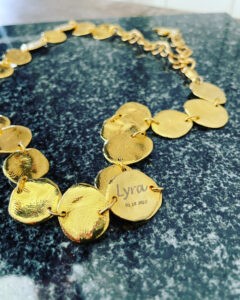 Collier chic avec disques dorés, personnalisé avec le nom ‘Lyra’, un cadeau intime et élégant.