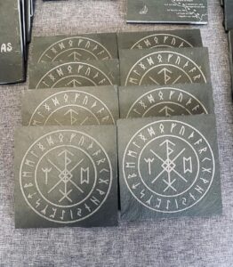 Sous-verres robustes en ardoise avec symboles viking, ajoutant une touche d’aventure à votre table.