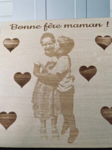 Plaque en bois avec image gravée pour la fête des mères, un doux message d’amour familial.