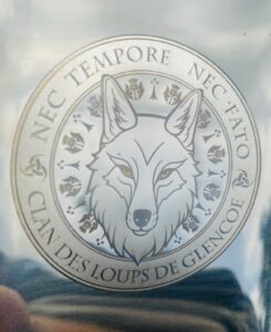 Plaque argentée avec emblème de loup, symbolisant la noblesse et la fierté du clan des loups de Glencoe