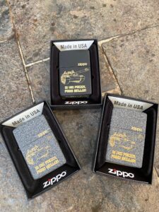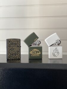 Personnalisation de plusieurs briquets Zippo avec logo de la Vendée, visuel Van Life et visuel viking, le top pour un cadeau personnalisé.
