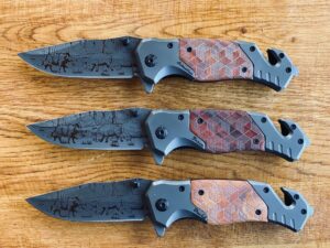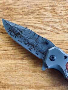 Couteau pliant avec une gravure détaillée de scènes de faune, reflétant l’essence de la nature