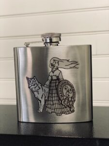 Flasque en acier inoxydable avec une gravure féminine et un loup, combinant finesse et nature