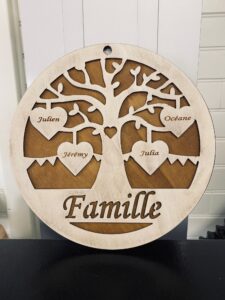Arbre en bois avec noms gravés, célébrant l’unité familiale