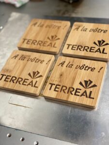 Sous-verres en bambou avec logo de l’entreprise, alliant fonctionnalité et personnalisation.