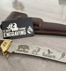 Gravure du couteau et de l’étui avec des scènes de chasse, un alliage d’art et de fonctionnalité.